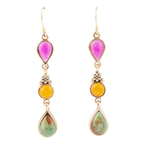 View full detailsCrafted and finished by hand, these stunning earrings are made of golden bronze and adorned with genuine blue turquoise, pink agate, and yellow qua...