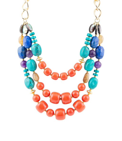 View full detailsThis stunning necklace is carefully handcrafted using genuine Magnesite, Amethyst, Abalone, Coral, Lapis and Citrine stones in a beautiful array of...