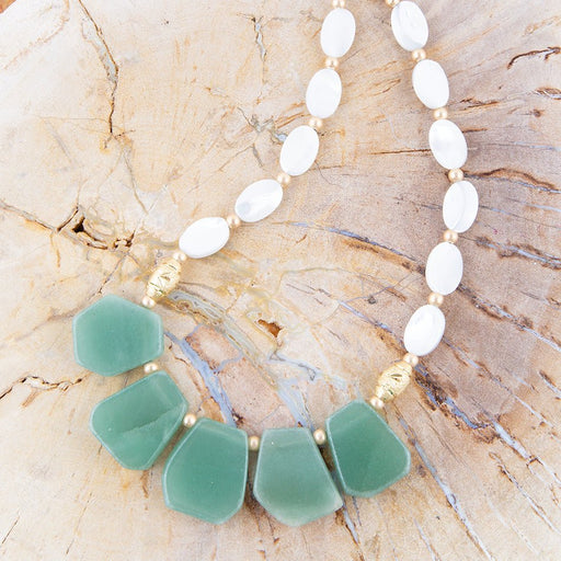 View full detailsEmbrace the natural beauty of the Dani Aventurine and Pearl Necklace. Hand-crafted with genuine mother of pearl and aventurine beads, this necklace...