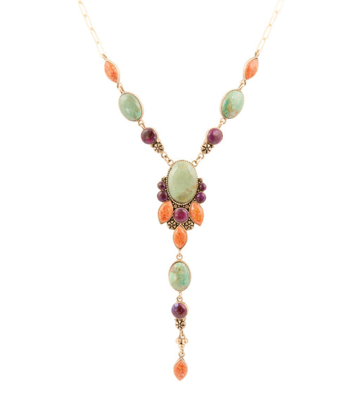 View full detailsElevate your look with our Regalia Blue Turquoise Purple and Orange Coral Golden Y Necklace. Genuine bronze and a mix of genuine blue turquoise, pu...