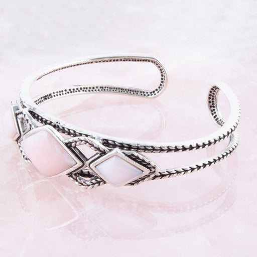 View full detailsThis Pink Opal and Sterling Silver Cuff Bracelet is the perfect jewelry accessory to add to any outfit. With three diamond shaped genuine pink opal...