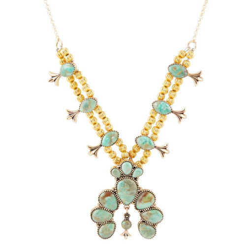 View full detailsUpgrade your jewelry collection with our Squash Blossom Statement Turquoise Golden Necklace. The genuine turquoise stones, set in intricate golden ...