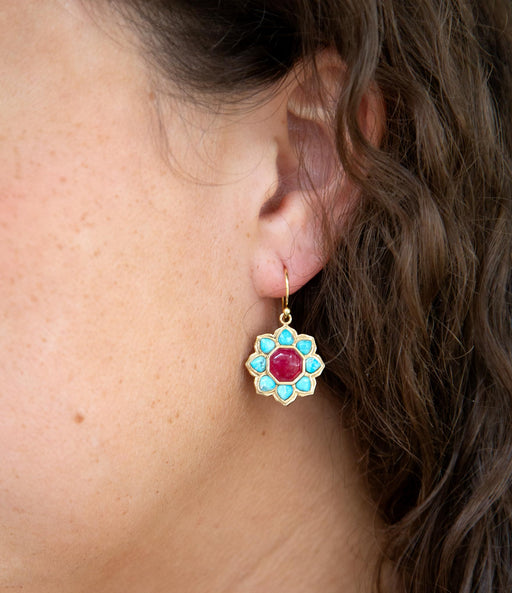 These earrings feature a stunning combination of Blue Turquoise and Red Quartz stones, crafted and finished by hand with golden bronze accents. The...