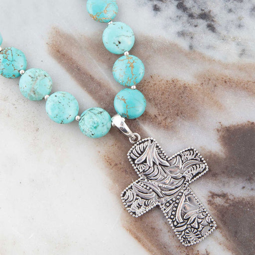 Handcrafted with passion and care, this necklace features stunning blue magnesite circled stones and intricate sterling silver details. The 16" cha...