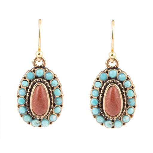 View full detailsExperience luxurious style with these unique Little Sedona Turquoise and Goldstone Earrings. Handcrafted with genuine turquoise stones that surroun...
