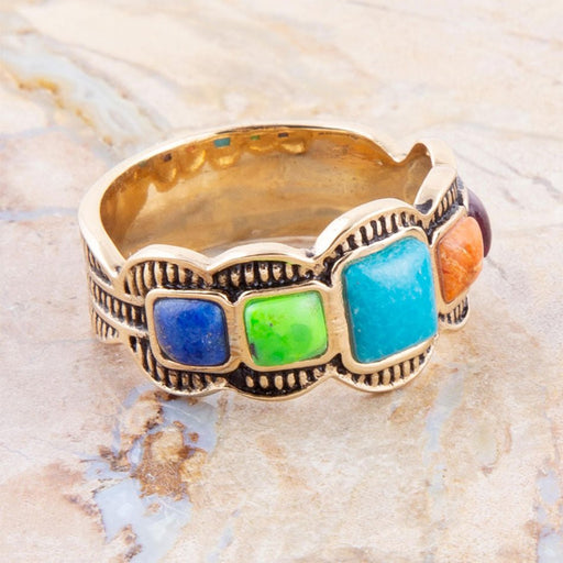 View full detailsExperience the beauty and craftsmanship of our Purple Turquoise Golden Ring. This stunning piece features a 1" tall golden bronze band adorned with...