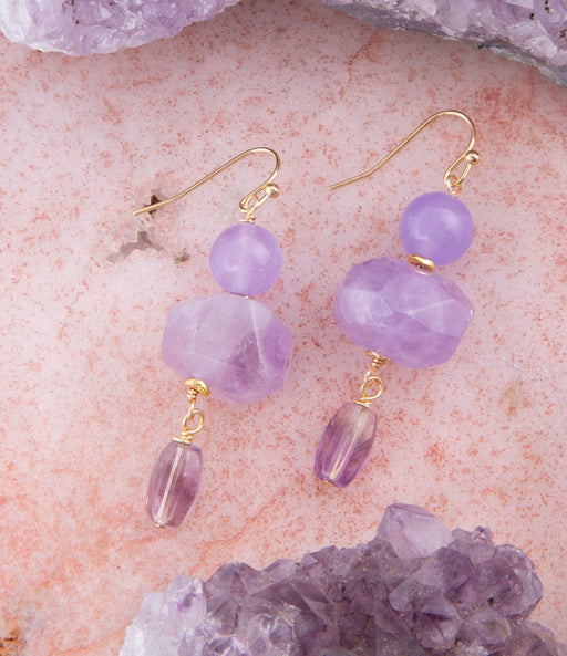 View full detailsThis pair of earrings showcases a beautiful combination of amethyst and jade stones, elegantly dangling 2.25 inches from the gold plated brass ear ...