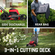- 3-in-1: rear bagging, side discharge, mulching