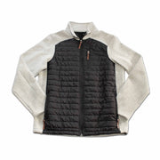 This contemporary jacket combines a quilted nylon vest with heather grey sweater sleeves, featuring a full-zip front and leather zipper pulls. It's water-repellent and windproof, utilizing Valtherm for excellent breathability. The honeycomb padding structure allows moisture escape while maintaining body temperature, ensuring comfort and longevity. Warm, soft, and practical, this versatile layering piece offers freedom of movement, making it ideal for transitional weather.