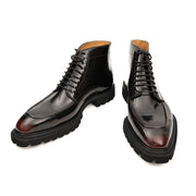The refined elegance of the upper, with its distinct apron/stitched toe detail, contrasts beautifully with the aggression of the sole. This subtle, bespoke touch introduces a level of sophistication that elevates the boot beyond typical military styling.