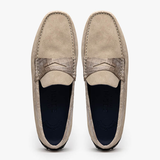 View full detailsMonza is a handcrafted driver modernized for all day comfort. Featuring a Crocodile penny strap and collar against Italian sueded calfskin, a rem...