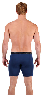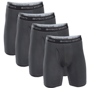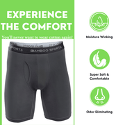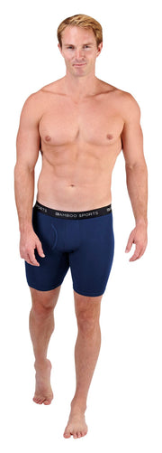 - STAY IN PLACE DESIGN MENS LONG LEG BOXER BRIEFS: Bamboo Sports long boxer briefs have a 6 inch inseam for those who prefer a longer fitting boxer brief that doesn't ride up. These bamboo boxer briefs have a functional front fly and pouch that is non binding and has enough stretch for comfort while still keeping everything in place. They also have a wide waistband so that your underwear stays in place without rolling.