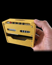 This handcrafted vintage-style amplifier* replica collectible is precisely proportionate to our 1:4 scale miniature guitars. The detail includes tweed like fabric, mahogany-built amp box, knobs, speaker detail, and much more. These miniature 1:4 replica collectible amplifiers make a great addition to any miniature guitar replica collection. *These are non-functioning models.