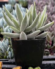 The Crassula mesembryanthemoides is a striking succulent known for its elongated, slender leaves covered in fine, velvety hairs. This unique texture gives the plant a silvery-green appearance, while its stems can develop a trailing or upright growth habit. Under bright sunlight, the tips of the leaves may take on a reddish hue, adding extra visual appeal. In the right conditions, it produces small, star-shaped flowers, making it a charming addition to any succulent collection.