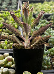 Mother of Millions, also known as Kalanchoe delagoensis, is a fast-growing, upright succulent known for its tall, slender leaves that are lined with tiny plantlets along the edges. These baby plantlets easily drop and root, making it one of the most prolific succulent varieties. Its green to grayish leaves often feature dark purple spots and can develop a reddish tint in bright sunlight, adding dramatic visual appeal.
