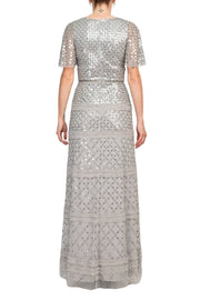 Aidan Mattox V-Neck Short Sleeve Beaded Sequined Piping Detail Zipper Back Mesh Gown