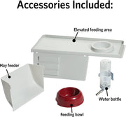 The Wabbitat Deluxe Rabbit Home provides a large and expandable living space, offering maximum comfort for rabbits, ferrets, guinea pigs, chinchillas, and other small animals. It assembles quickly and easily without tools and comes ready-to-go with accessories, including a removable hay feeder, water bottle, and feeding bowl. The elevated feeding area creates a privacy space underneath, and the stationary feeding bowl reduces spills during meals.