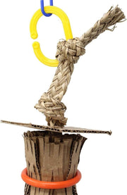 The 2203 Ring Roll from Bonka Bird Toys is a super shredding good time for your beaked buddy! This bird toy has lots of easy to rip cardboard that pet birds love. The top of the bird toy includes a one-of-a-kind plastic Clink (the second link small link in the picture is not included). This Clink loops through a knot in the woven seagrass strip that runs through the length of the toy. This seagrass strip is all-natural, has lots of grooves, and feels great in pet bird's beaks and feet. The middle of the bird toy has (2) cardboard squares that sit on the top and bottom of a roll of perforated shreddable cardboard. This cardboard is held in place with (2) colorful plastic rings. The woven seagrass strips sticks out of the bottom making for perfect pulling fun! As your pet shreds the toy apart it will move all about and change its shape. The 2203 Ring Roll is 100% bird safe and weighs and measures approximately: Height: (15) inches Width: (4) inches Weight: Under (4) ounces * Easy to shred bird enticing toy. * Lots of soft cardboard. * Natural seagrass strip. * 100% bird safe.