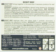 Biokit reef combines 5 prodibio reef aquarium range products in one box biodigest is made up of nitrifying, nitrate reducing and facultative bacterial strains selected for their ability to convert ammonia into nitrites, nitrites into nitrates and nitrates into nitrogen. Bioptim is a natural product that affects cellular bioactivators. It has been specially formulated to accelerate the cellular metabolism of most of the bacteria that live in aquariums. Reef booster is a complete nutrient supplement containing all the elements required by the invertebrates that feed solely or partly on microplankton and for zooxanthellae carrying coral which need additional microplankton. Iodi+ supplies the hard corals in your aquarium with the iodine they need to grow and for coloration. It also helps them to adapt to lighting variations and neutralises the excess oxygen produced by zooxanthellae under excessive lighting and therefore combats coral bleaching. Stronti+ provides all the strontium needed for optimum and healthy coral, clam and coralline algae growth.