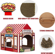 • [PERFECT GIFT / 180-DAY MONEY BACK]: Created with A Premium Pressed Cardboard, this cat house for indoor cats is dense . Lovely Burger Shop design with portable features makes it a perfect gift for your kitty's birthday, friends and family. We offer 180-DAY money back guarantee. For any manufacturing defect or if you are not completely satisfied, we promise 100% money back without return. Your satisfaction is guaranteed!