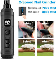 Introducing our Dog Nail Grinder with 2 LED Lights. With a maximum speed of 7000 to 8000 rmp, this grinder is perfect for small, medium, and large dogs. The built-in lights make it easier to see and trim your dog's nails. Keep your furry friend's paws happy and healthy with this professional tool.