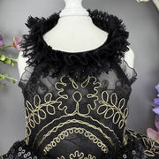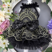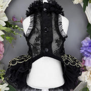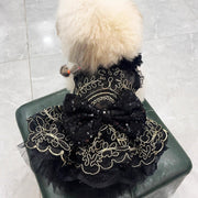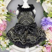 Turn your pet into a true queen with this black and gold luxury dog dress. Featuring intricate lace embroidery, elegant gold accents, and a sparkling sequin bow, this outfit is designed for unforgettable moments. The lightweight layered fabric keeps pets comfortable while looking glamorous.