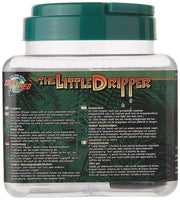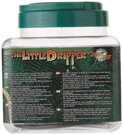 Zoo Med little dripper Zoo Meds drippers simulate natural rainfall and provide humidity for captive reptiles. The dripper has a folding handle lid that allows you to suspend the dripper above the enclosure. Especially helpful for animals that do not readily drink standing water and instead drink dew from leaves (i.e. old world chameleons). Our drippers are available in two sizes, the one gallon big dipper little dripper. Color blacks and grays, size 70 ounces.
