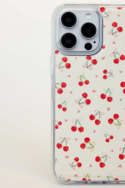 Case Design: Watercolor red cherries with bright ribbons and pink hearts on a cream background.