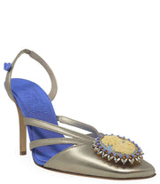 The Madison Maison Blue Gold Leather High Heel Slingback is a statement shoe that will elevate your wardrobe. Expertly crafted with the finest Italian leather, the closed toe and cameo detail showcase artistry and quality. Handmade by the best tanneries and stylishly designed, these heels are the perfect way to make a fashion statement.