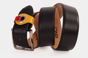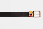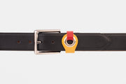 Elevate your ensemble with our coordinating belt, meticulously crafted to complement the distinct style of our men's bit loafer. This belt mirrors the dynamic design of the loafer, featuring two belts—one in vibrant yellow and the other in rich red—threaded through a silver ring for a bold and eye-catching look.
