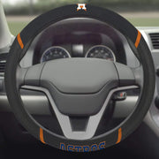Add a special accent to your drive with a Embroidered Steering Wheel Cover from Sports Licensing Solutions. Our covers are made with a combination of faux suede and fabric mesh they make the perfect accent to any interior. Not only does the suede and mesh add a touch of style, but also gives you extra grip while keeping your hands warm in the winter and cool in the summer. There are 2 logos on the cover the team’s primary logo is embroidered on the top and then teams name is on the bottom. We embroider the logos so that they will not peel or fade after use while driving. With a 15 inch diameter the covers are compatible with most vehicles, just set in the sun to soften the rubber core before installation.