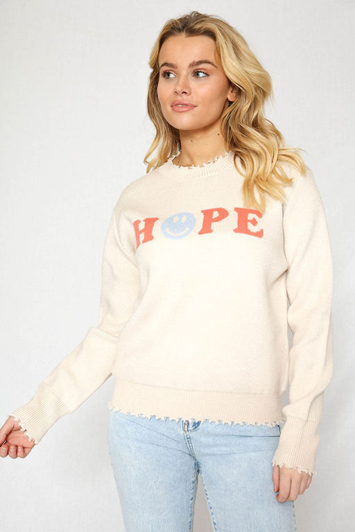 - In-house designed knit intarsia-Tattered detail at hem, cuffs and collar