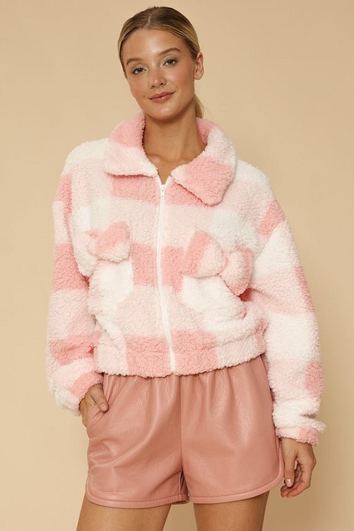 -Self bow detailing on pockets, body fully lined-Zipper front closure-Elastic at cuffs and hem *Model is 5'7" wearing a size small