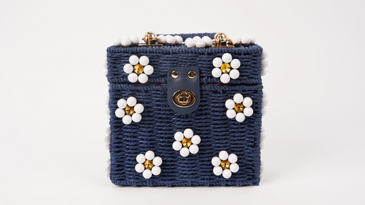 View full detailsNavy Blue Purse + White Daisy with Yellow Rhinestone Center Top handle with turn lock closure | Ships with gold shoulder chain | Dims: 6.29"x 3.34...