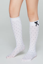 Dense knee-highs EVIE with a decorative bow and a "dots" pattern knitted from black polyamide thread will complement the everyday and festive wardrobe of a little fashionista.