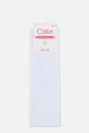 Ribbed cotton knee-high socks CLASSIC with a delicate “Conte” pattern will be the finishing touch to your stylish look. Soft and pleasant to the touch, they fit snugly and stay in place thanks to the wide elastic band.
