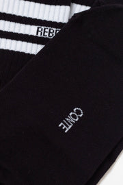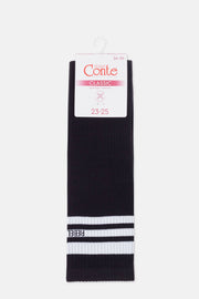 Sporty knee-high socks CLASSIC made of soft, tactile cotton that fit snugly and stay in place thanks to their thoughtful design: the entire shaft (from heel to top edge) is knit with added elastane threads, forming an elastic band.