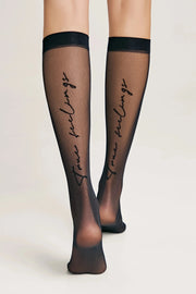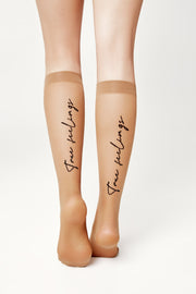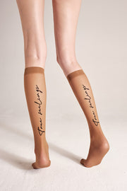 Sheer fantasy women's knee-highs TRUE LOVE with an elastic band and a stylish "true feelings" print.