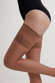 Sheer and elastic fantasy stockings FLAME with are the embodiment of delicacy and elegance. A wide 12 cm lace top with a refined pattern gently hugs the thigh, enhancing your look while remaining comfortable throughout the day. Two silicone bands on the inside ensure secure fixation without slipping. A sheer toe and unshaped structure make these stockings a versatile choice, perfect for open shoes.