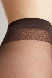 Elastic fantasy tights GLAM combine two top trends of the new season — imitation of stockings and textured vertical stripes. Special attention deserves the stocking-style band made of lurex with the knitted “Conte” inscription.