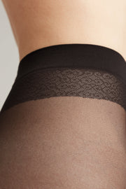 Elastic fantasy tights GLAM combine two top trends of the new season — imitation of stockings and textured vertical stripes. Special attention deserves the stocking-style band made of lurex with the knitted “Conte” inscription.