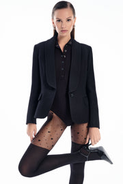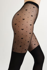 KARMEN tights with a faux over-the-knee effect and heart pattern are designed for feminine and eye-catching looks. Opaque on the lower part and sheer on the top, they create a stylish "knee-high" illusion, while the delicate hearts add a romantic charm. These tights offer a perfect fit and comfort, making them an elegant match for any outfit.
