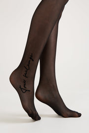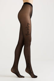Sheer and elastic fantasy tights TRUE LOVE with a "tattoo imitation" print — a black polyamide inscription located on one leg at the ankle and thigh area.