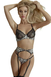 •Delicate lace and seductive floral/leopard print construct this lingerie set
