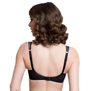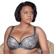 Bra for full-busted women who want maximum support with fashionable flair. Foam-lined angled bra cups & a low center gore lift & gently push your breasts toward the center of your chest for natural round shaping & sexy cleavage - without the bulk of padding. This bra has three-part cups for added breast support. Lining prevents nipple show-through. Its smooth fabric & deep-V center plunge make it fashion friendly for t-shirts & low-cut tops. Beautiful overlay lace made by Italian fabric producer Iluna. Available in extended band sizes from 34 to 44 & extended cup sizes up to G.