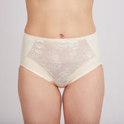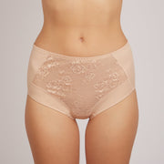 Classic slip briefs made from elastic knit fabric, non-elastic lace fabric, and elastic lace, with a high waistline.