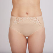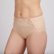 Slip briefs made from elastic fabric and elastic lace. High waistline. The front lower parts are made with a fold.