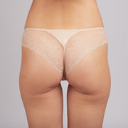 Briefs made from elastic fabric and elastic lace. Medium waistline. The lace on the back piece is untrimmed, without any edging.