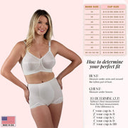 The Rago Lacette Satin and Lace Wireless Support Bra 2101 supports and shapes the breasts with fiber filled, lined, seamed wireless cups. Features beautiful floral lace, non-stretch straps and tall sides with boning. Rago's Lacette Satin and Lace Wireless Support Bra is made of nylon/spandex.