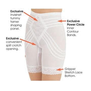 The Rago Shapette Long Leg Shaper with Contour Bands 679 features an exclusive Invisinet tummy tamer panel that shapes comfortably with firm control for every day. Contour bands shape waist, hips, back and derriere. Flat-sewn seams provide a smooth fit. Rago's Shapette Long Leg Shaper with Contour Bands feature a split crotch that makes it easy to use the restroom with the shapewear on.